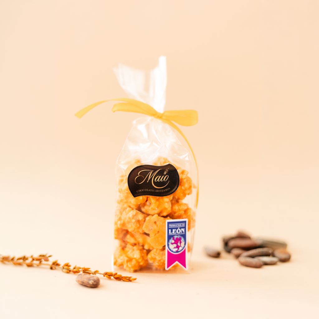 Rocas de Chocolate de naranja y almendras, peso aprox 150g. Fabricado en España, en la región leonesa de la Ribera del Esla, de forma artesanal por Chocolates Maio.